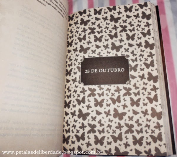 Sobre a parte visual/diagramação do livro: as folhas são amareladas, o tamanho da letra e das margens é ótimo. A capa e a contracapa são lindas! Não dá pra ver na foto, mas onde está escrito “A Fada” é como se fosse em alto relevo. Esse é um dos livros mais lindos que tenho (e veio autografado)! Cheio de detalhes, a parte interna da capa é dourada e cheia de borboletas (ou devo dizer fadas?), a história é divida em datas e tem capítulos curtos e numerados. Minhas fotos não ficaram muito boas, mas já dá pra ter uma ideia de como esse livro é bonito. Ganhei um marcador de páginas junto com o livro, ele também tem estampa de borboletas.Belo trabalho Fantasy Casa da Palavra!